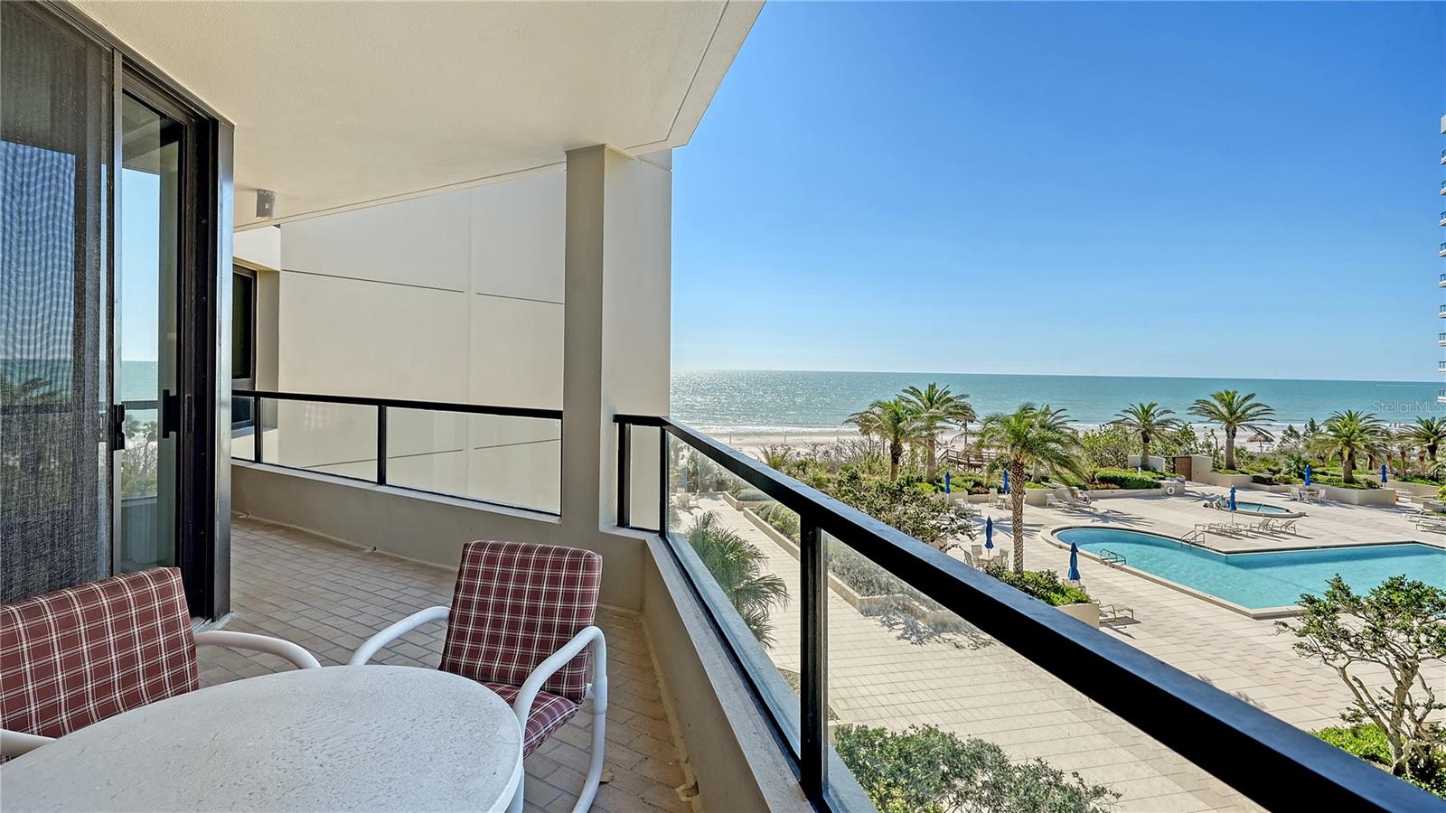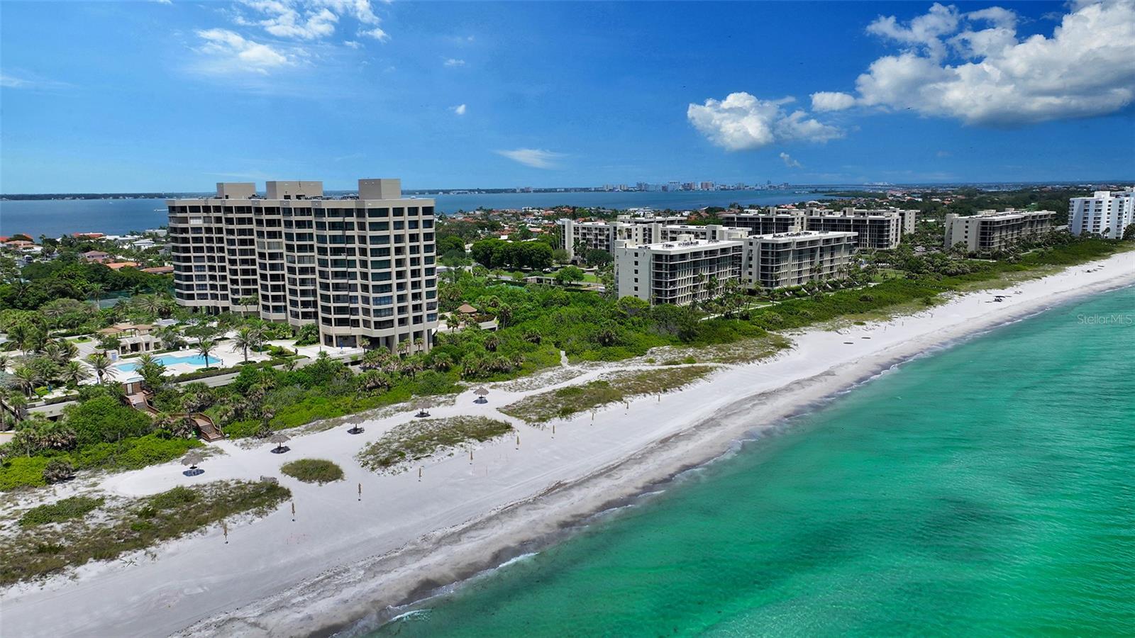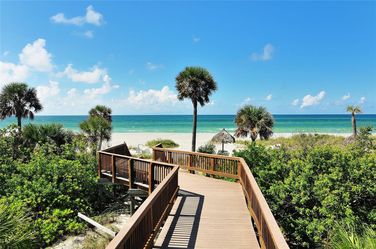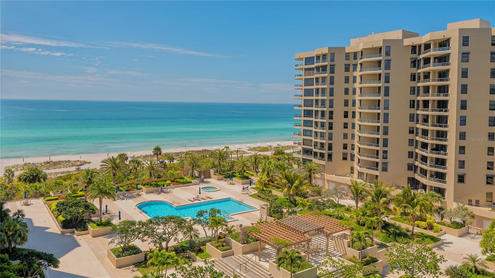 Discover this sunny coastal residence in the prestigious Promenade community. This two-bedroom residence spans more than 1,800 square feet, offering sweeping views of the Gulf of Mexico and lushly landscaped grounds. A sunset-facing terrace invites you to bask in gentle beach breezes while taking in breathtaking vistas of the sparkling water and tropical scenery. Step inside to an open-concept layout designed for comfort and style. Walls of floor-to-ceiling sliders allow natural light to pour into the spacious living areas. The galley-style kitchen offers plenty of storage and counter space, complete with a cozy dining area overlooking the Gulf. Adjacent to the great room, built-in cabinetry and a wet bar make entertaining effortless. The primary suite is a private sanctuary, positioned for maximum Gulf views and direct terrace access. His-and-her walk-in closets provide ample storage, while the en-suite bath features dual vanities, soaking tub, and separate glass shower. The split-bedroom layout ensures privacy, with the second bedroom offering its own walk-in closet and full en-suite bath. The Promenade is a premier, full-service community where residents enjoy a luxurious beachfront lifestyle. Recent renovations have enhanced its resort atmosphere, including a 24-hour manned guard gate, concierge service, and secure under-building parking. The amenities are unparalleled, with a state-of-the-art fitness center, four Har-Tru tennis courts, social gathering spaces, and a Gulf-front sundeck with shaded gazebos, grilling areas, and ample seating. A heated swimming pool and spa, along with private beach access and charming tiki huts, complete the experience. Located on the southern end of Longboat Key, The Promenade offers convenient access to the vibrant arts, dining, and shopping scene of St. Armands Circle, as well as downtown Sarasota's cultural attractions. Whether you're looking for a year-round residence or a vacation escape, this Gulf-front retreat delivers the perfect balance of luxury and relaxation.
