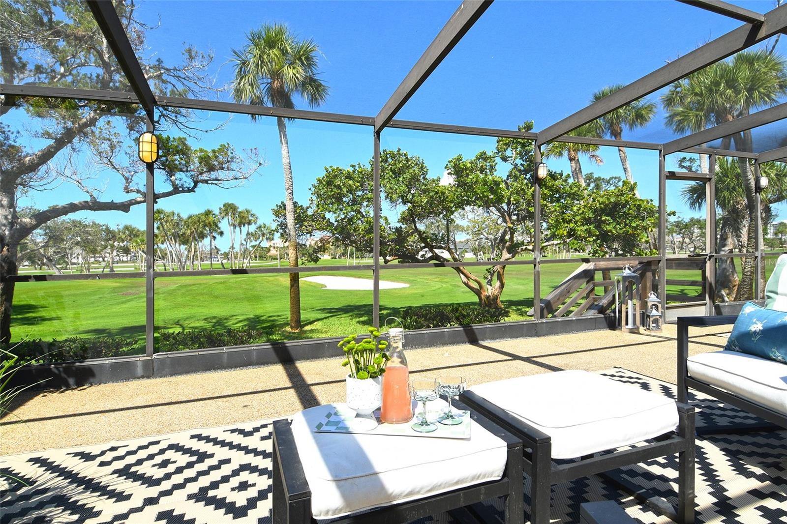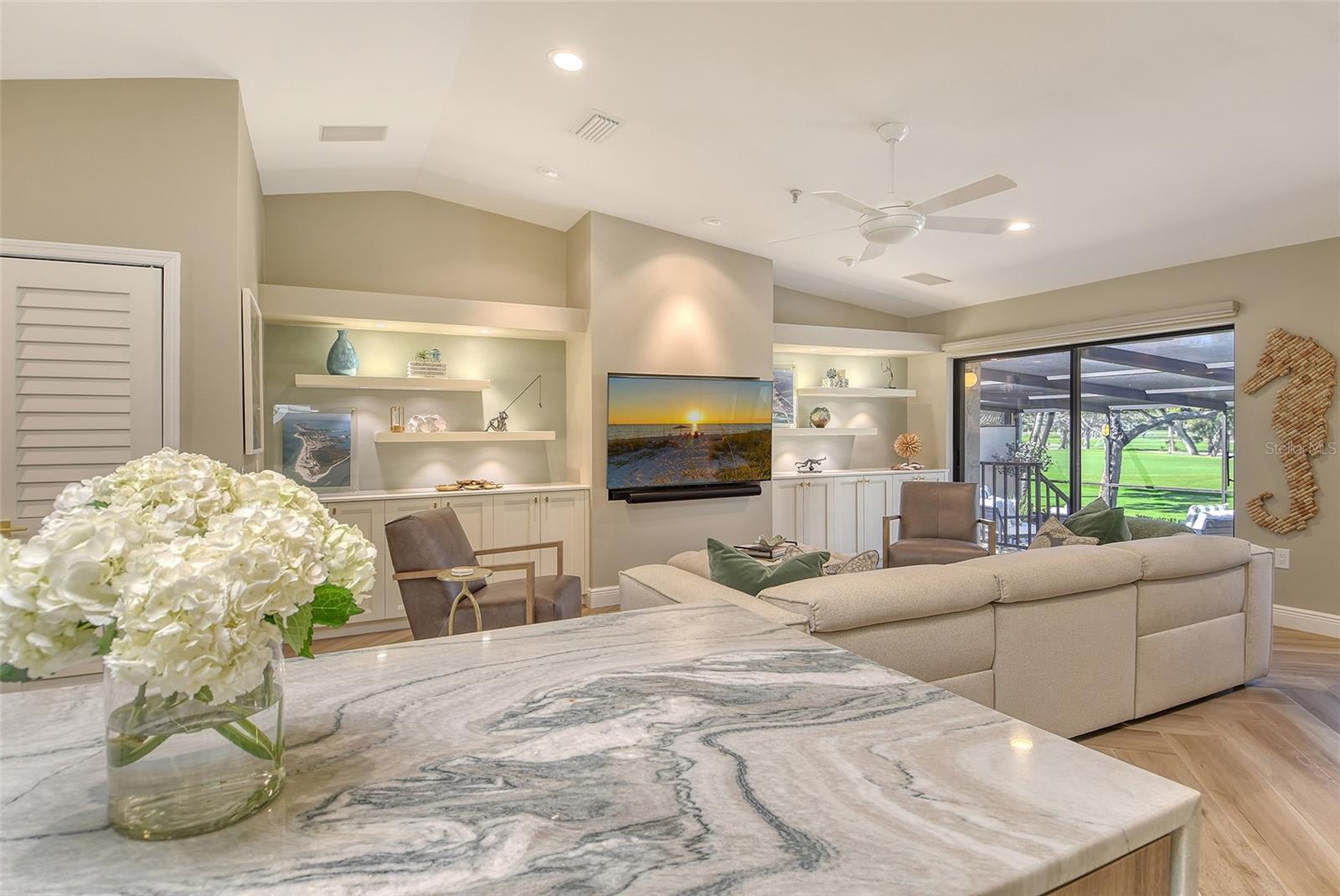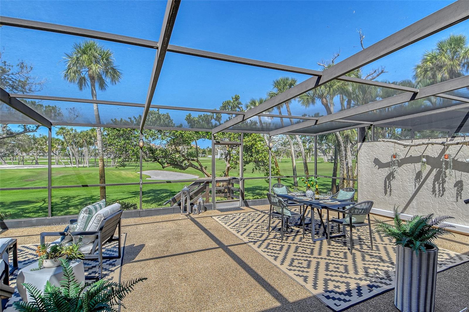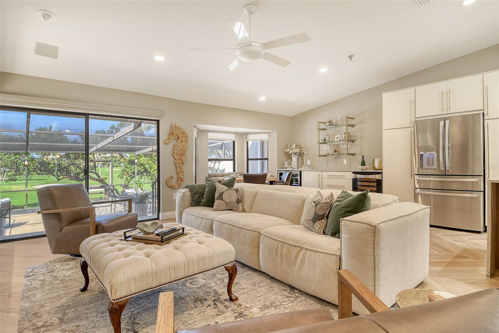 A highly desired ground floor unit with no upstairs neighbors, the villa features soaring ceilings, radiant skylights, and expansive golf course views. Over 800 square feet of screened lanai space overlooks the Harbourside Golf Course, creating a tranquil setting for morning coffee or evening entertaining.