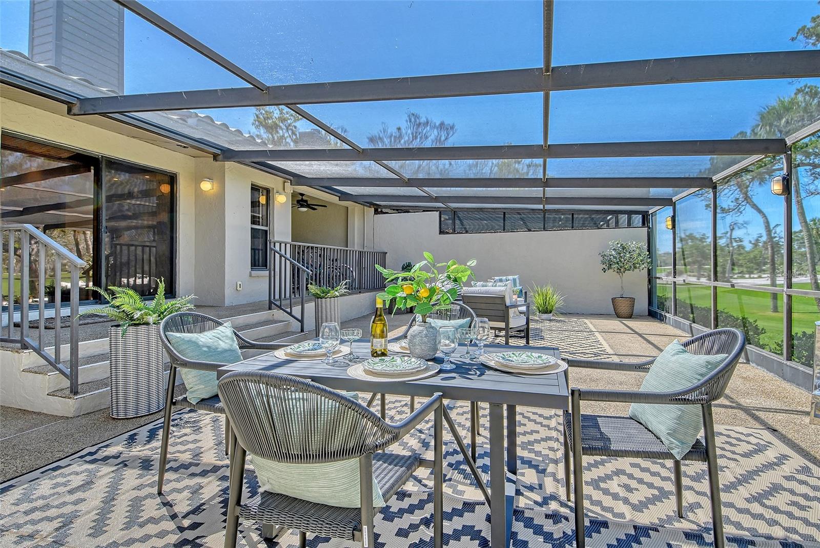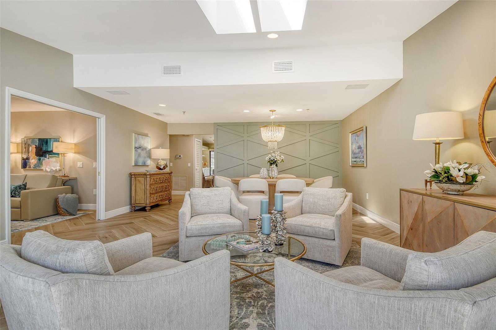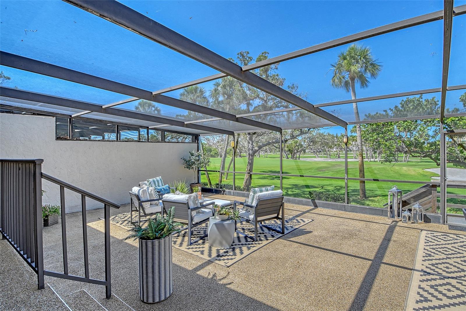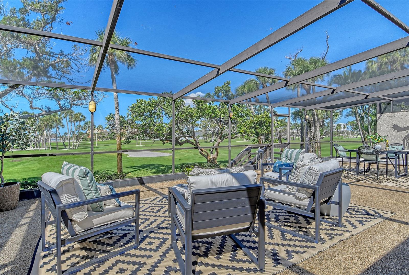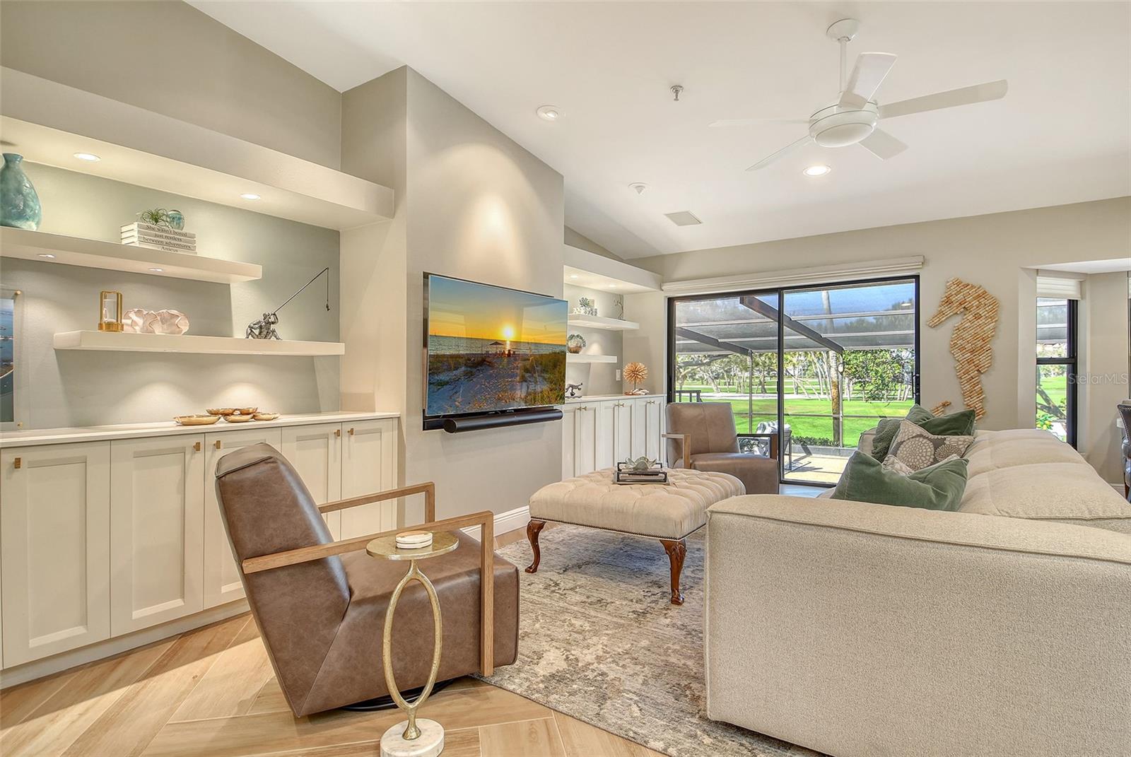 A highly desired ground floor unit with no upstairs neighbors, the villa features soaring ceilings, radiant skylights, and expansive golf course views. Over 800 square feet of screened lanai space overlooks the Harbourside Golf Course, creating a tranquil setting for morning coffee or evening entertaining.