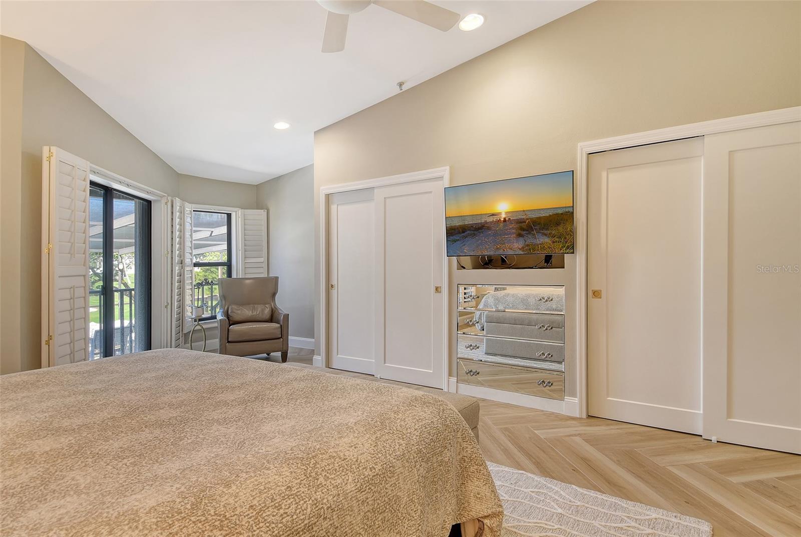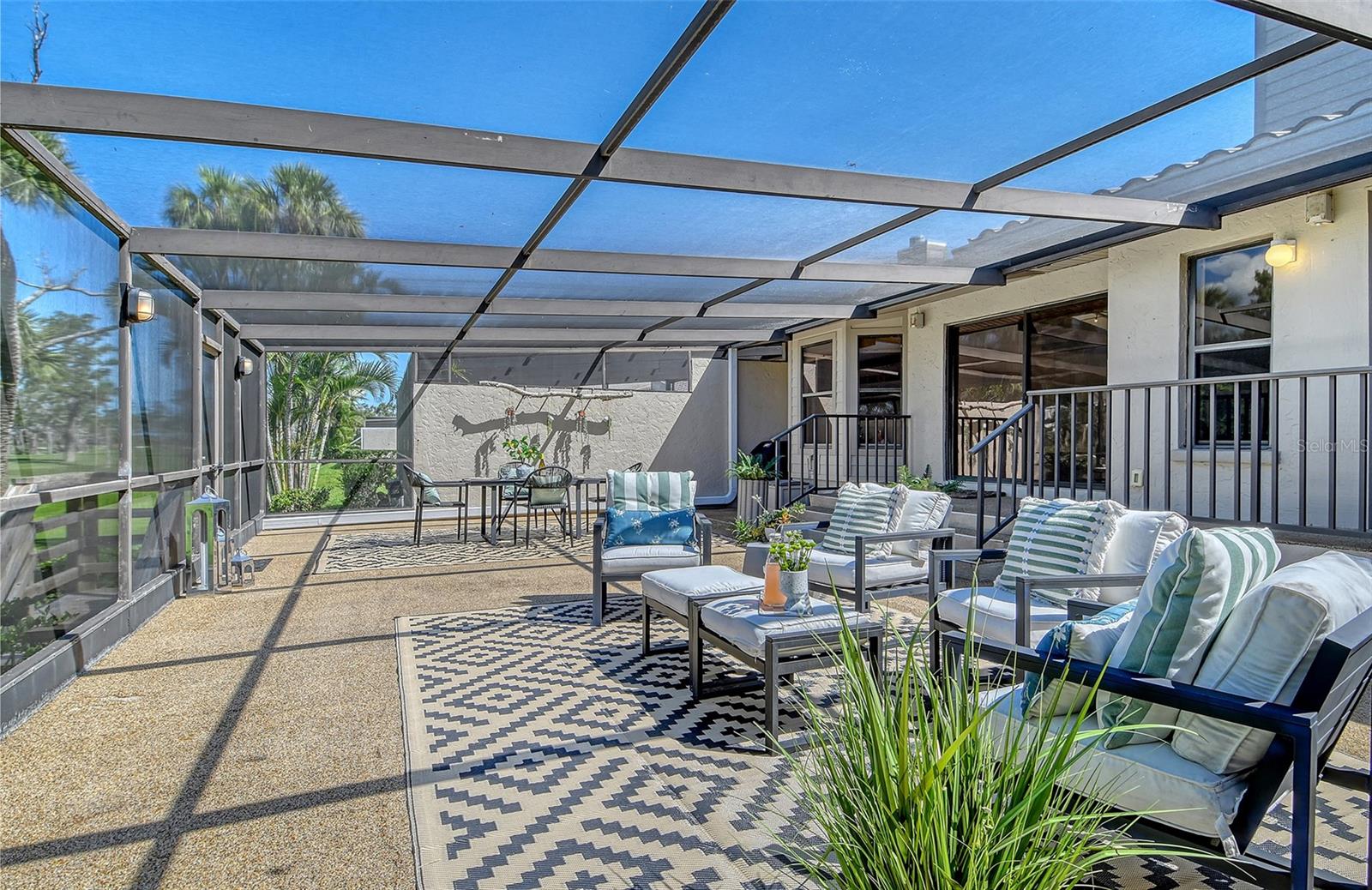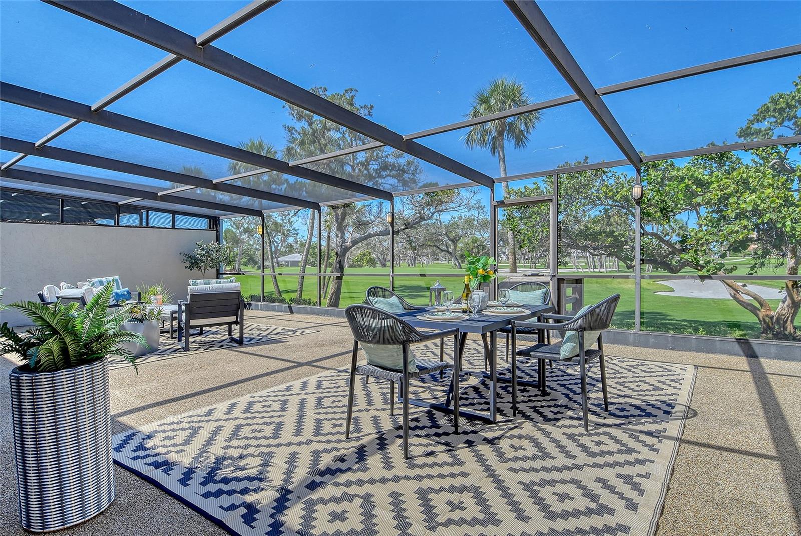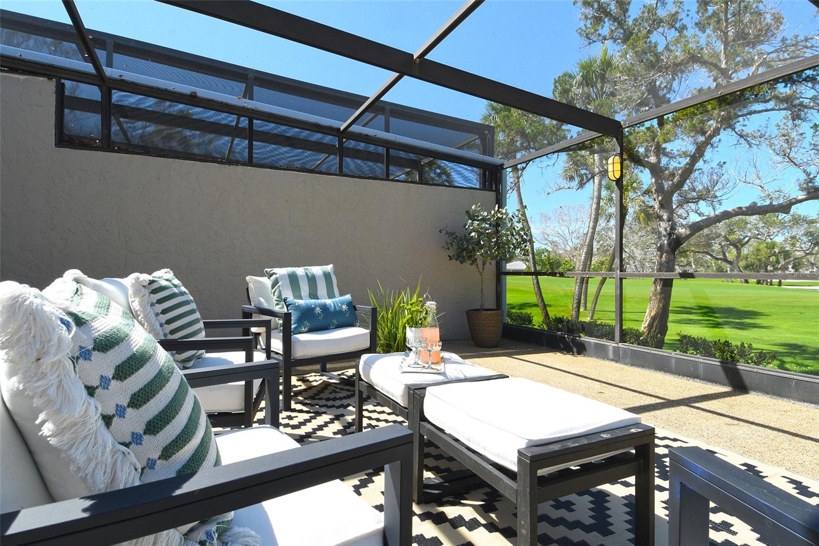 A highly desired ground floor unit with no upstairs neighbors, the villa features soaring ceilings, radiant skylights, and expansive golf course views. Over 800 square feet of screened lanai space overlooks the Harbourside Golf Course, creating a tranquil setting for morning coffee or evening entertaining.