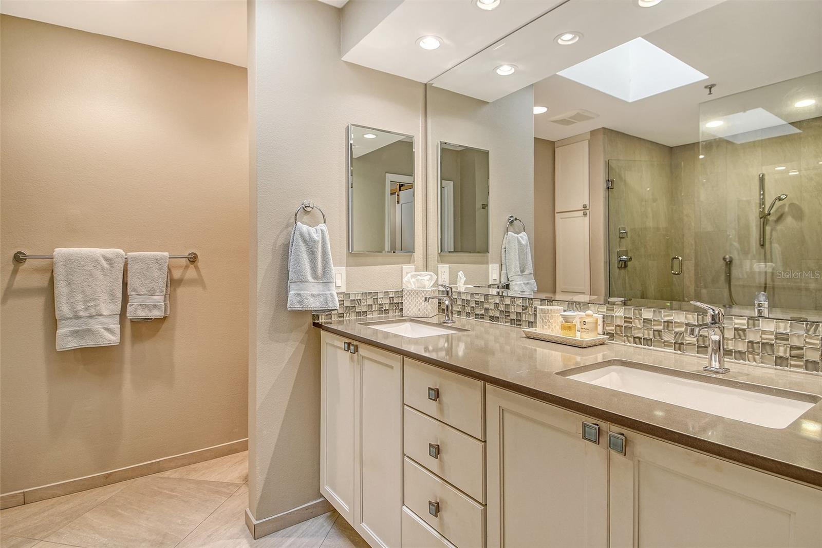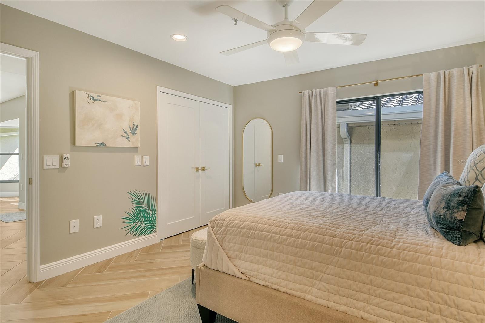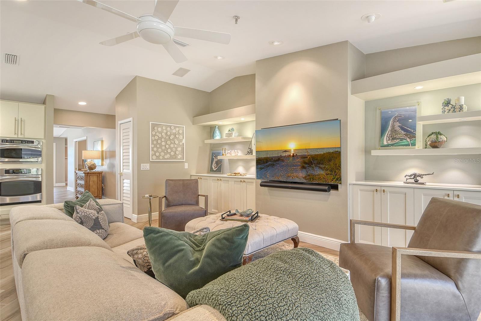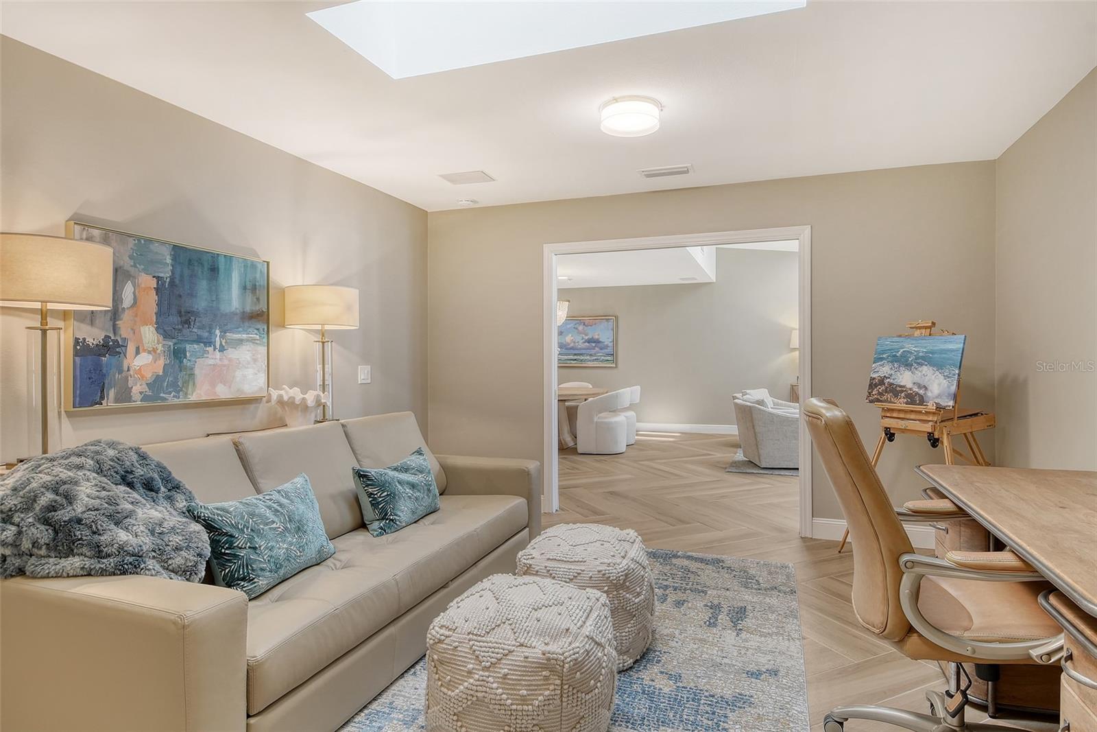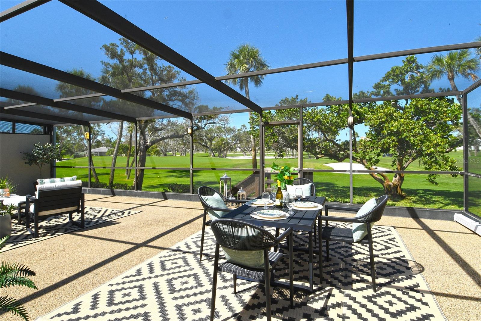 A highly desired ground floor unit with no upstairs neighbors, the villa features soaring ceilings, radiant skylights, and expansive golf course views. Over 800 square feet of screened lanai space overlooks the Harbourside Golf Course, creating a tranquil setting for morning coffee or evening entertaining.