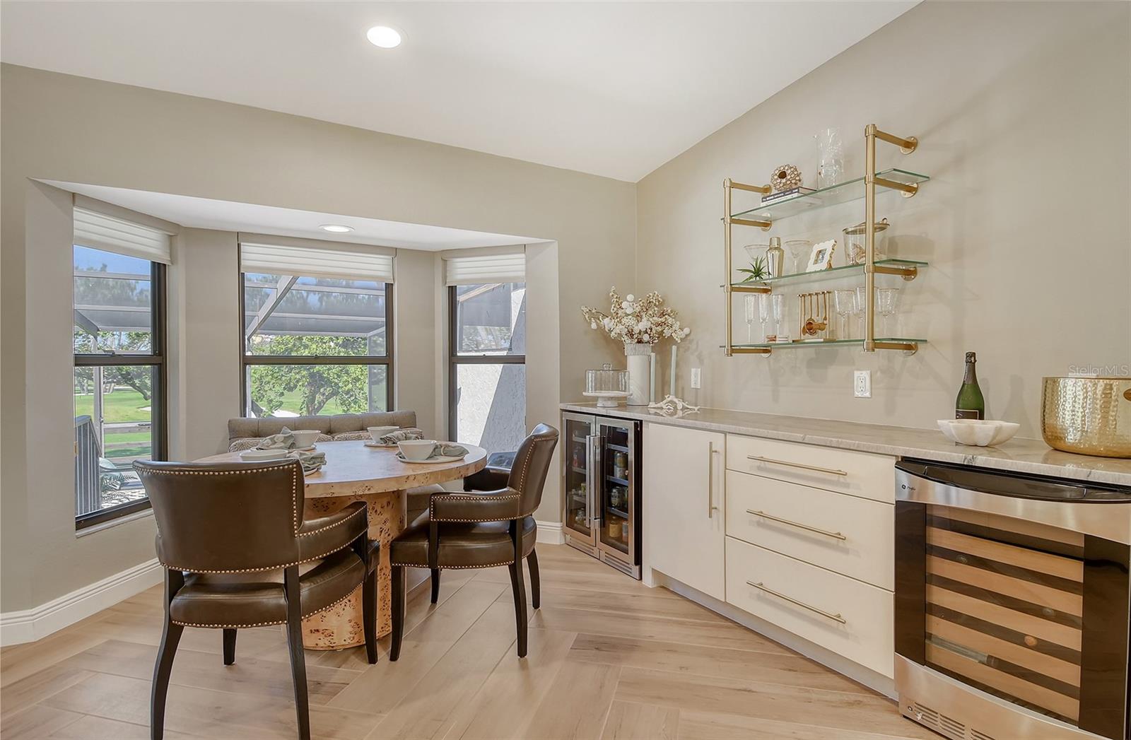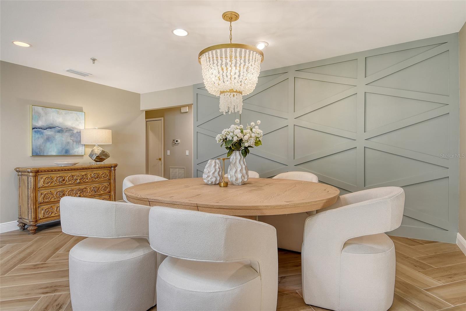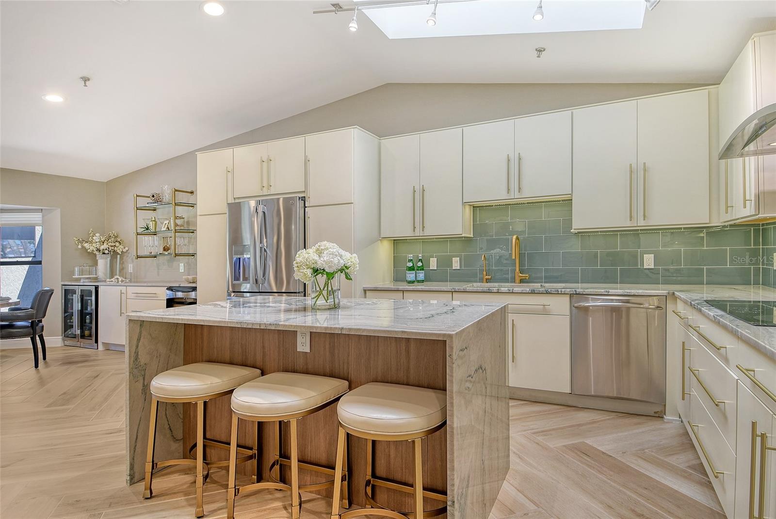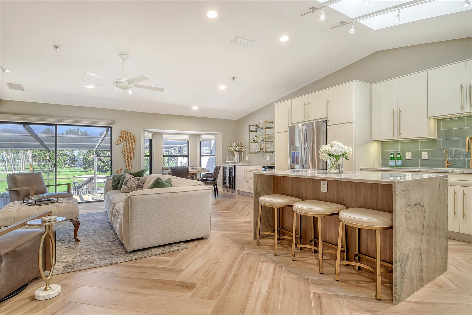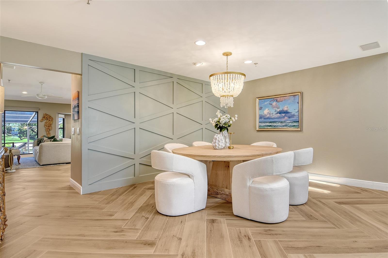 Step inside to an elegant formal living and dining area with herringbone-pattern wood-look tile and a striking geometric feature wall. The open layout and stunning floors continues to the rear of the home, where a spacious kitchen-family room offers custom built-ins, a French bistro-inspired bar area with open shelving, a waterfall island, and a sunny breakfast nook. Tucked off the family room is a dedicated half-bath.