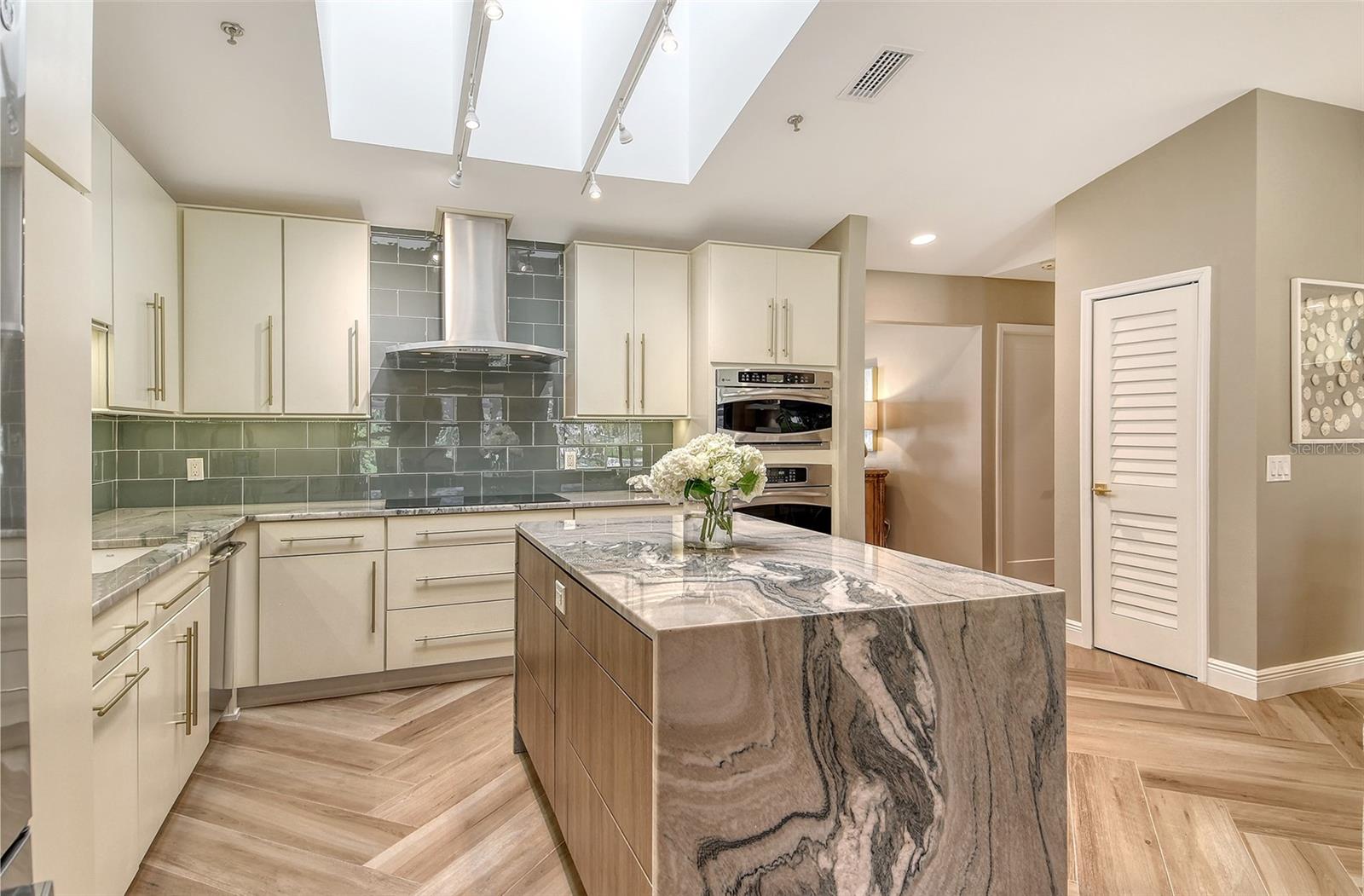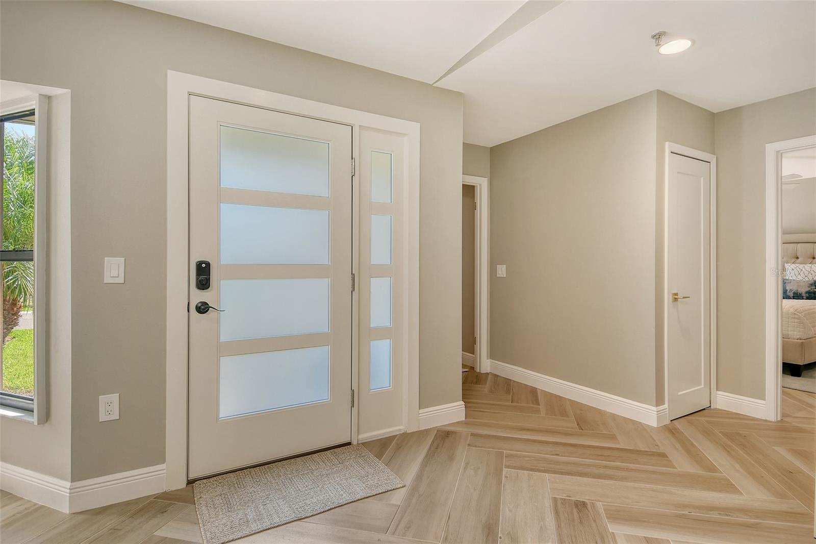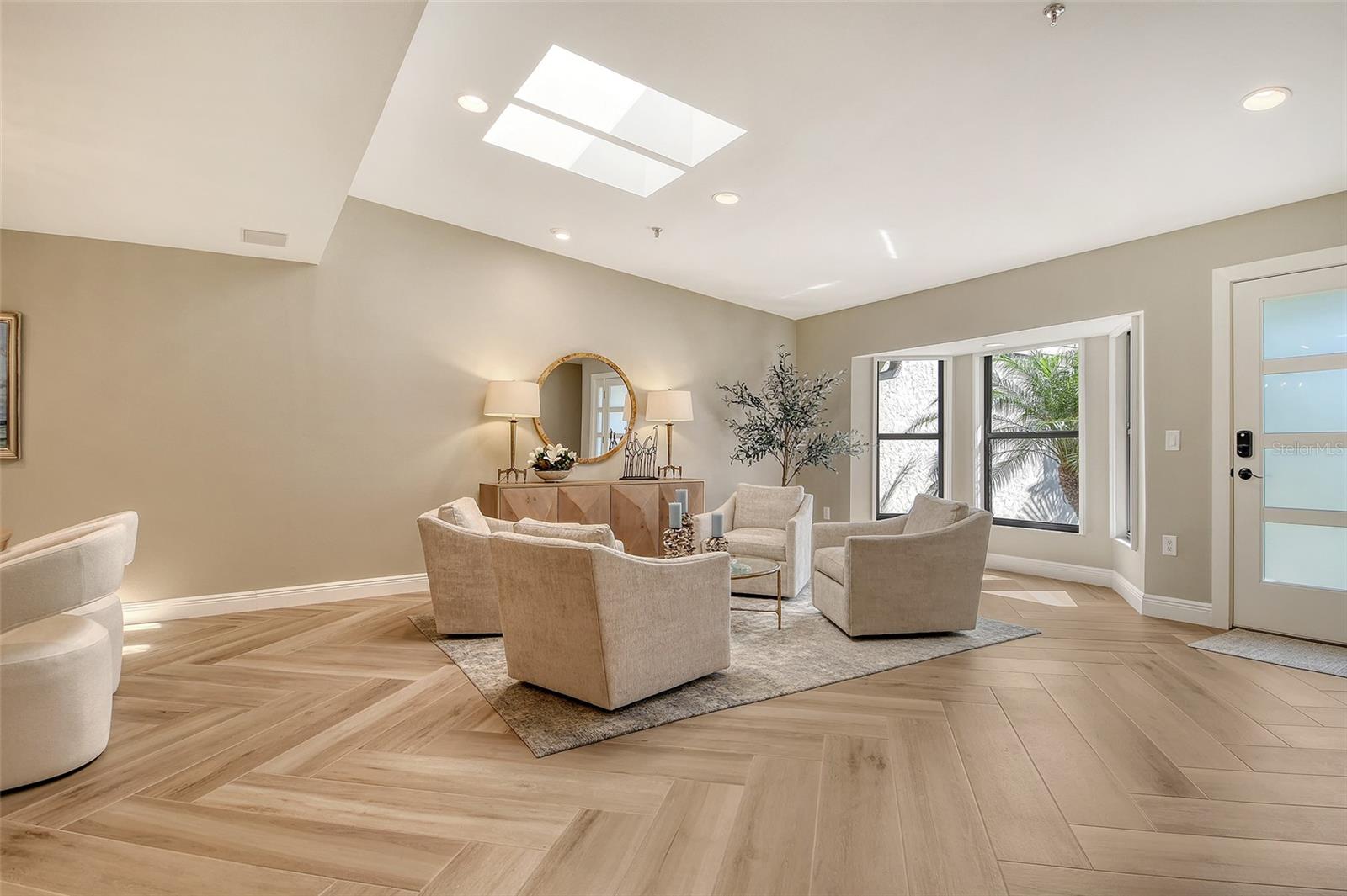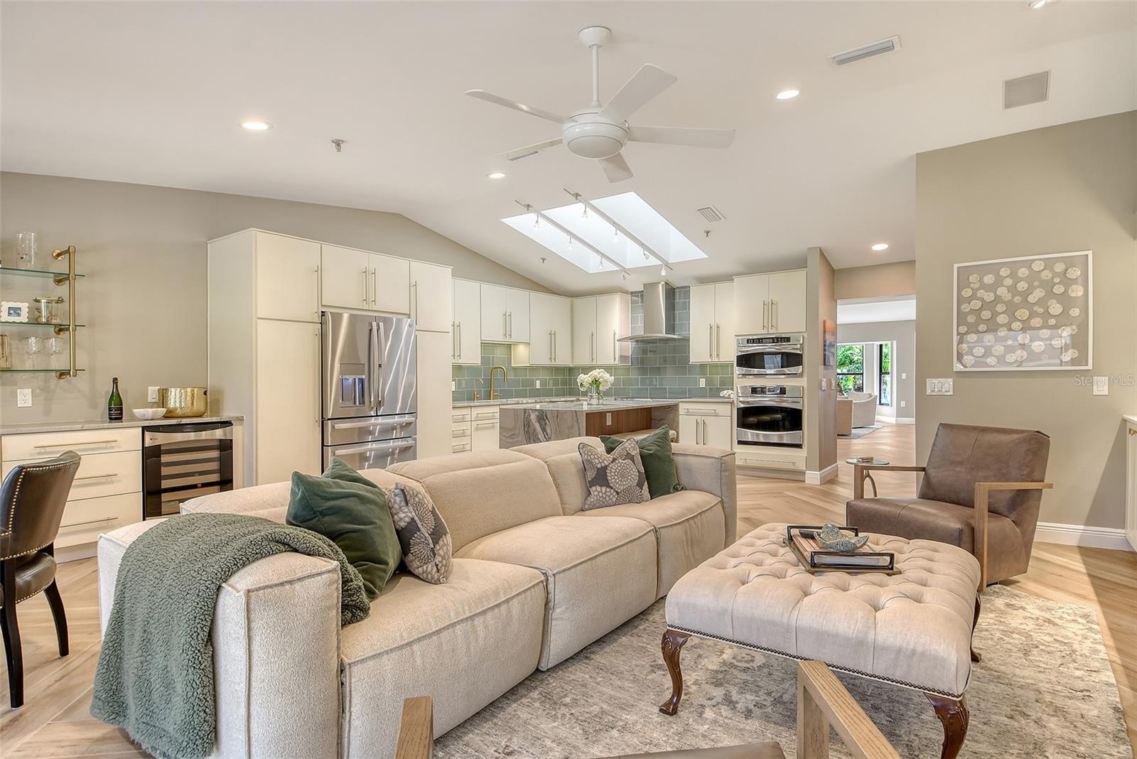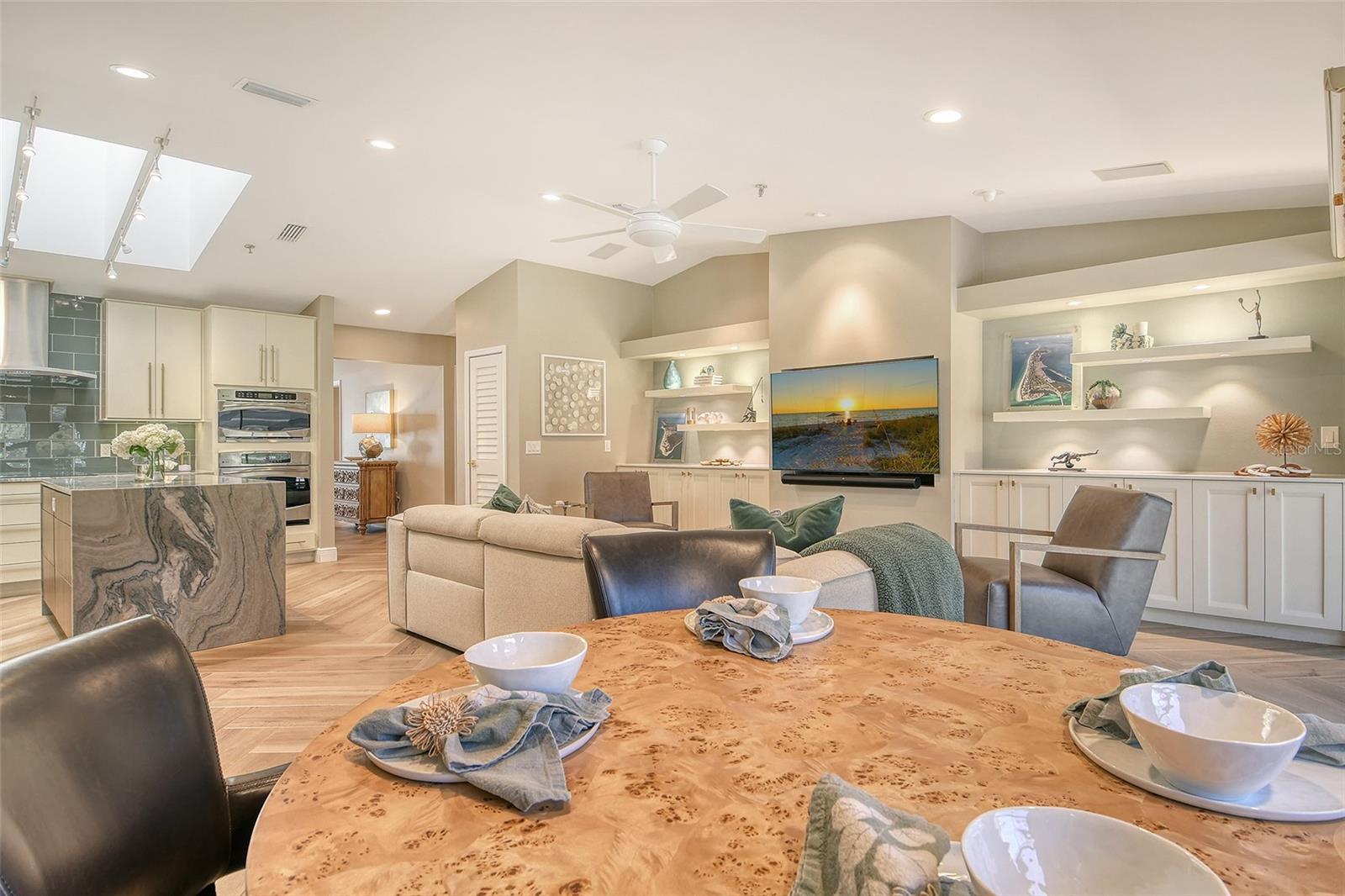 Step inside to an elegant formal living and dining area with herringbone-pattern wood-look tile and a striking geometric feature wall. The open layout and stunning floors continues to the rear of the home, where a spacious kitchen-family room offers custom built-ins, a French bistro-inspired bar area with open shelving, a waterfall island, and a sunny breakfast nook. Tucked off the family room is a dedicated half-bath.
