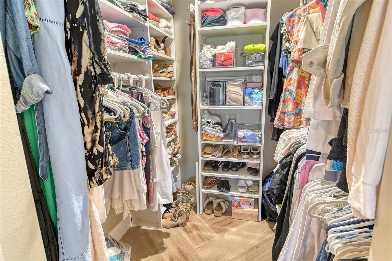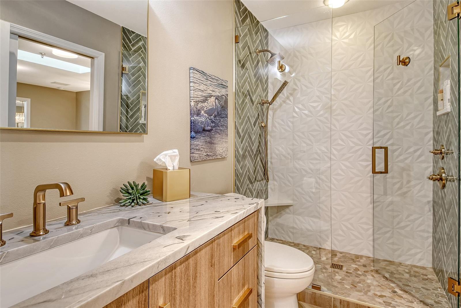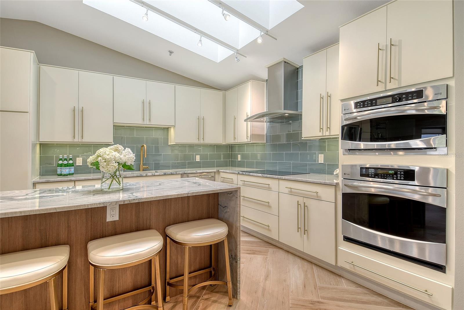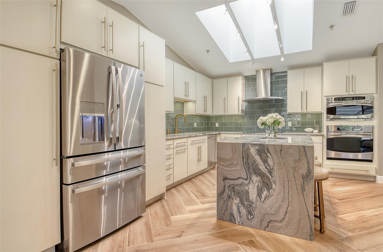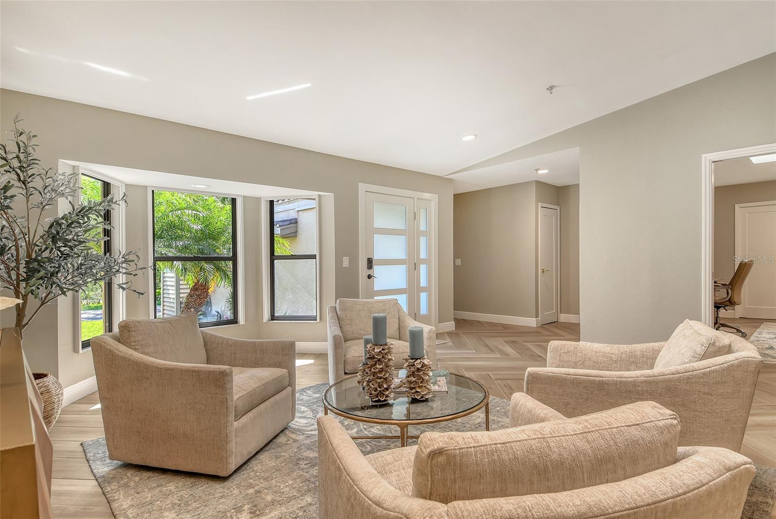 Step inside to an elegant formal living and dining area with herringbone-pattern wood-look tile and a striking geometric feature wall. The open layout and stunning floors continues to the rear of the home, where a spacious kitchen-family room offers custom built-ins, a French bistro-inspired bar area with open shelving, a waterfall island, and a sunny breakfast nook. Tucked off the family room is a dedicated half-bath.